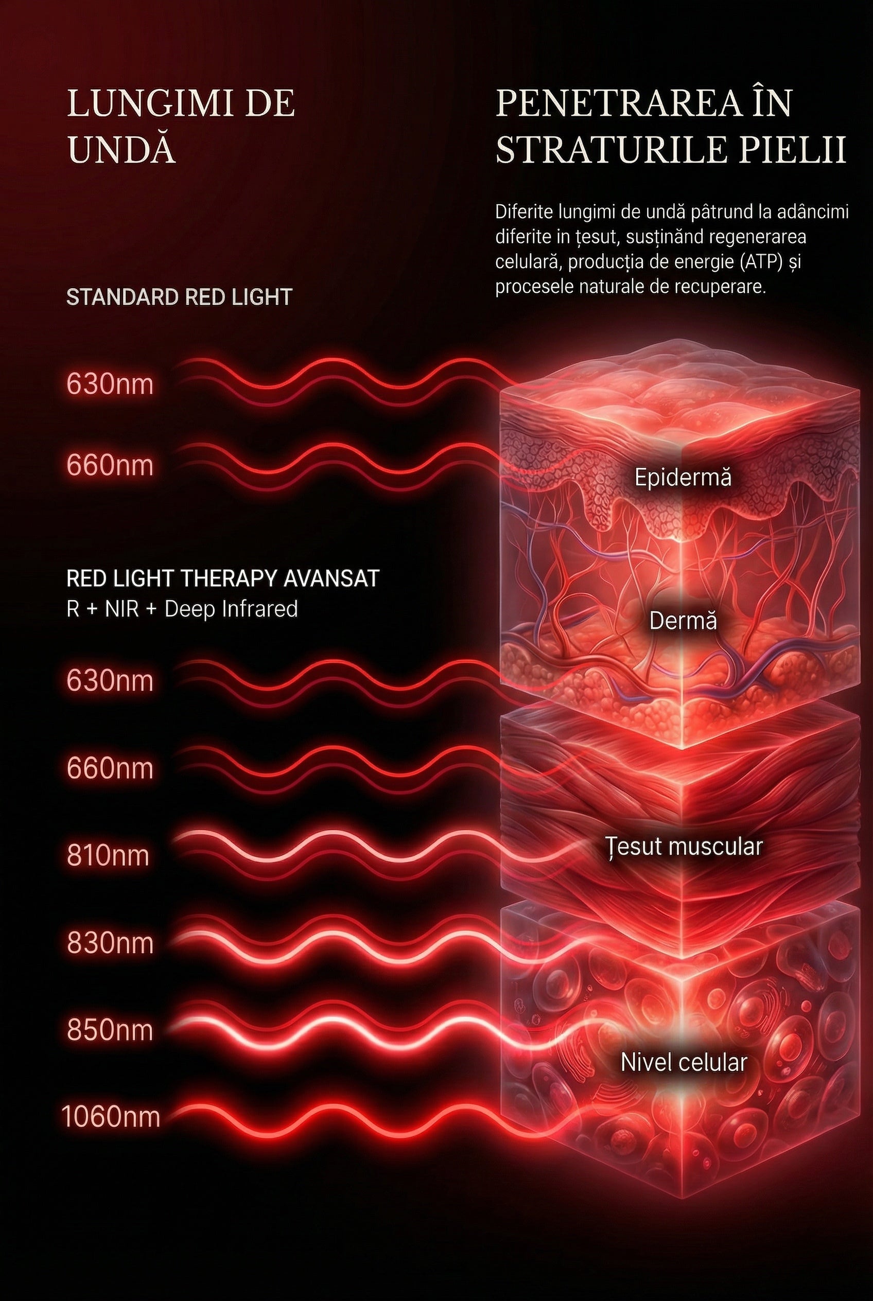 RED acționează predominant la nivel superficial (piele), iar NIR pătrunde mai profund, susținând țesutul muscular și articular. Efectele apar prin utilizare consecventă și dozare corectă.